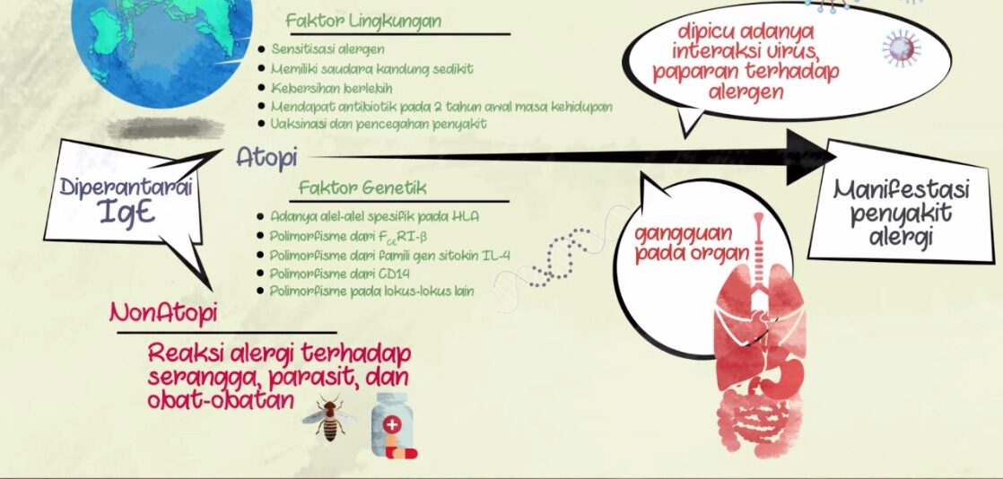 Atopi atau bakat alergi pada seseorang akan muncul selain adanya faktor genetik, juga adanya faktor lingkungan yang mendukung. Faktor genetik berupa adanya kelainan pada kromosom – kromosom tertentu. Faktor lingkungan meliputi adanya sensasi alergen memiliki saudara kandung sedikit, kebersihan berlebihan, mendapat antibiotic pada dua tahun awal masa kehidupan, dan tidak mendapat vaksin untuk pencegahan penyakit. Atopi dapat berubah menjadi alergi apabila terdapat gangguan pada organ target seperti sel dinding suara nafas, saluran cerna, atau kulit.