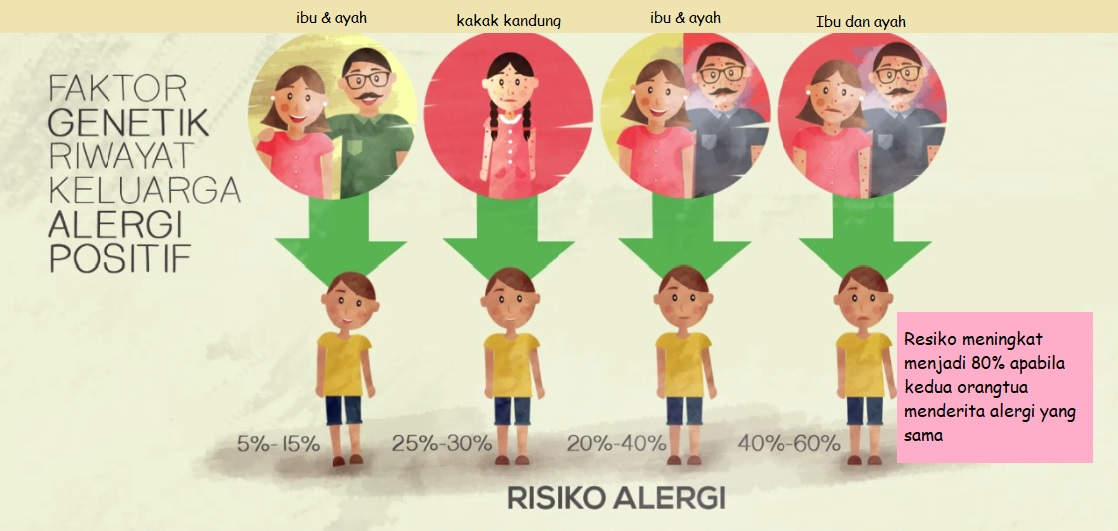 Jika kedua orangtua dan saudara kandung tidak memiliki alergi maka anak tersebut memiliki resiko alergi 5 – 15 %, jika dalam suatu keluarga salah satu saudara kandung positif alergi maka risiko alergi anak tersebut 25 – 30 %, Jika salah satu orangtua memiliki penyakit alergi maka risiko alergi yang diturunkan kepada anaknya sebesar 20 – 40 %, dan jika kedua orangtuanya memiliki riwayat alergi, maka risiko yang diturunkan kepada anaknya sebesar 40 – 60 %. Namun, risiko tersebut dapat meningkat menjadi 80 % apabila kedua orangtuanya memiliki penyakit alergi yang sama.