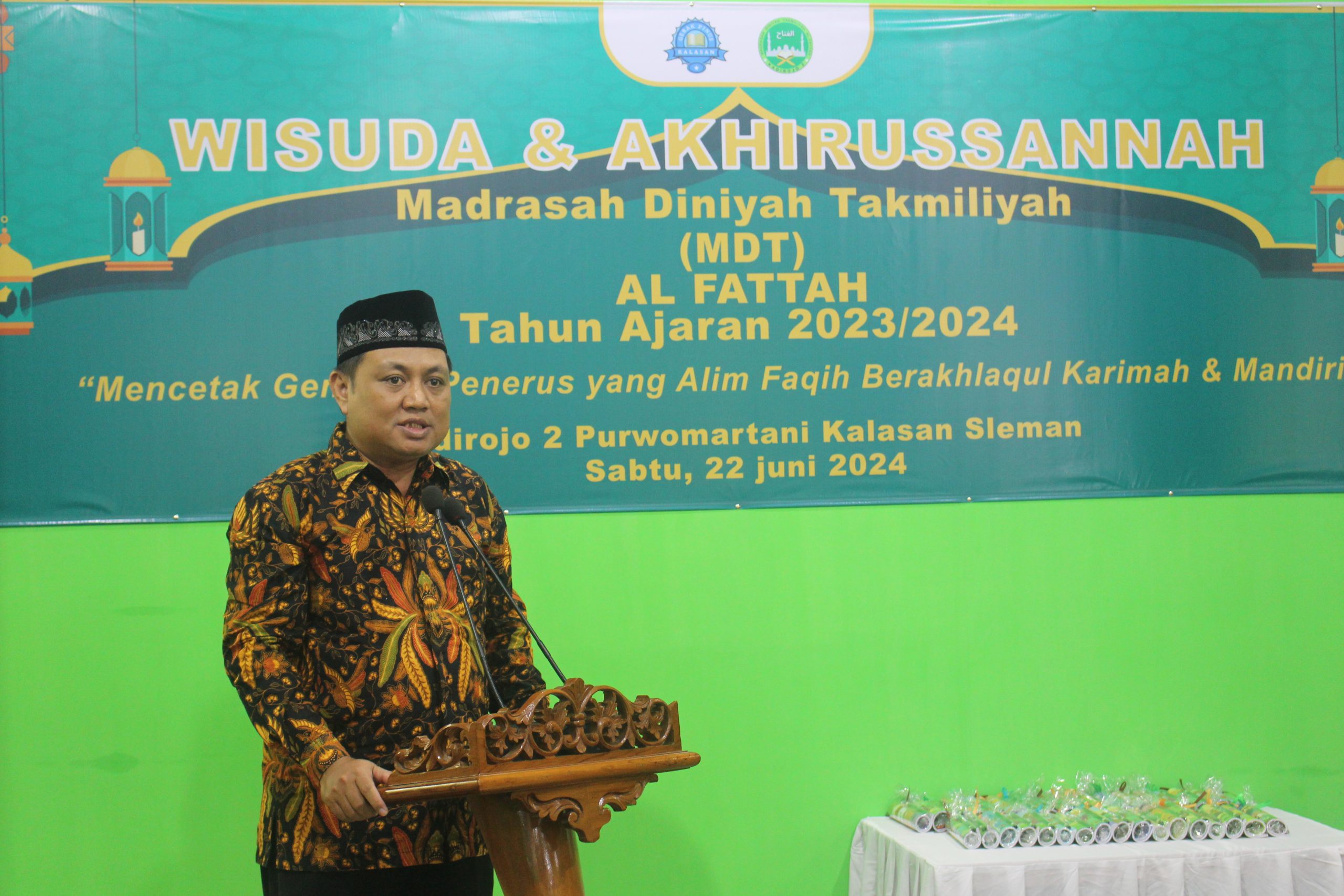 “Selamat kepada para wisudawan. Selamat untuk para pendidik. Semoga MDT Al Fattah Kalasan menjadi pondasi yang kokoh untuk terciptanya generasi yang memiliki ahlak yang mulia. Di era sekarang, banyak orang pintar yang tidak bermoral, sehingga banyak yang dengan mudahnya melakukan tindak ckiminal,” ujar Budi dalam sambutannya.
